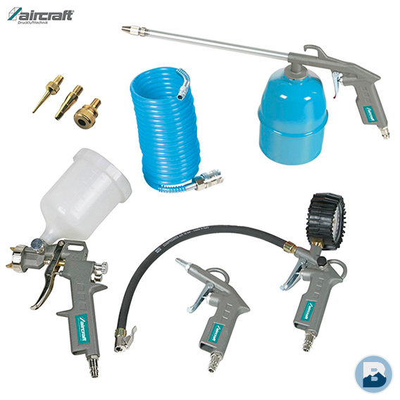8-delig assortiment van pneumatisch gereedschap. Bestaat uit 1 kort blaaspistool, 1 bandenblazer, 3 blaasstukjes, 1 verfpistool, 1 vernevelpistool en 1 spiraalslang.