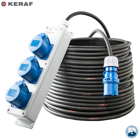 Topkwaliteit 3-aderige klasse I stroom verlengkabel met aangemonteerde CEE contactstop en KERAF 17313 verdeeldoos.